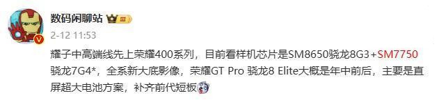 此前,该博主曾曝光称,“耀子中高端线先上荣耀400系列,目前看样机芯片是SM8650骁龙8G3+SM7750骁龙7G4*,全系新大底影像,荣耀GT Pro 骁龙8 Elite大概是年中前后,主要是直屏超大电池方案,补齐前代短板”。同时,近日,荣耀终端股份有限公司旗舰手机产品经理 @荣耀李坤 也发文称,“简单透露,今年上半年发布,且轻薄还得看荣耀,必须行业第一。”