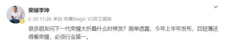 另外, @数码闲聊站 近日还曾曝光称,“荣耀Magic V4确定上半年登场,之前摸到的信息是6月,同样是超轻薄大折叠,看能不能破8.9mm 年中前后耀子新机很多,400系列、Magic V4、Magic V Flip2、GT Pro,开始下饺子”。有业内人士推测,荣耀Magic V4在轻薄方面很可能会有新突破,有可能在新型钛合金铰链与超薄陶瓷复合中框的加持下,让该机再次刷新轻薄纪录。