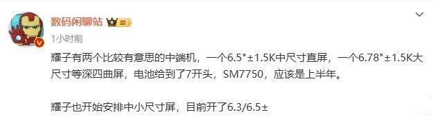 日前,数码博主 @数码闲聊站 曝光了 @荣耀手机 或将带来两款中小屏中端机型的消息,据其称,荣耀手机这两款中端新机一款采用6.5"±1.5K中尺寸直屏,一款采用6.78"±1.5K大尺寸等深四曲屏,电池给到了7开头,搭载SM7750(预计对应骁龙7 Gen4处理器),应该是上半年发布。并称『荣耀也开始安排中小尺寸屏,目前开了6.3"/6.5"±显示屏』。